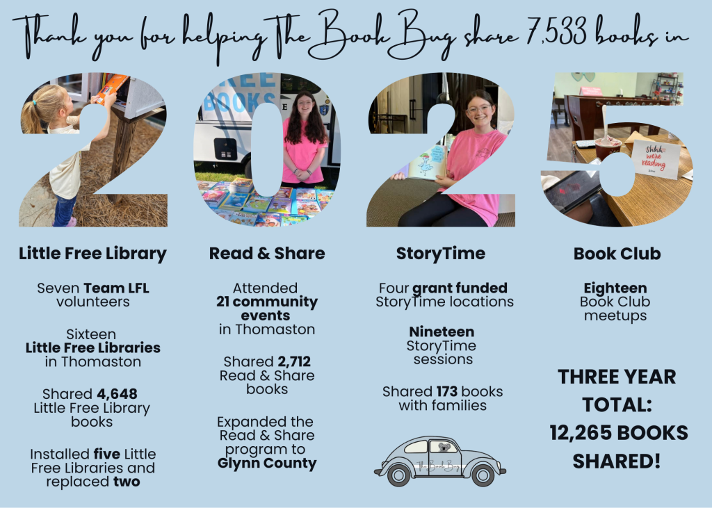 Since 2023, The Book Bug has shared 12,265 books in Upson County! As we start 2026, we urgently need community support to keep our programs going. Just $10 puts 4 brand-new books into the hands of local children, and every donation through our GoFundMe directly supports book purchases for our Read & Share program. Your gift today helps ensure families in our community continue to have access to books in the year ahead.